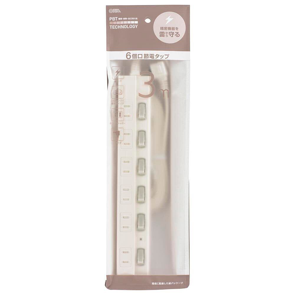 オーム電機 節電タップ 雷ガード 6個口 3m ランプ付き個別スイッチ 感電防止シャッター付きコンセント ホワイト HS-TPK63W-22 00-1578 OHM