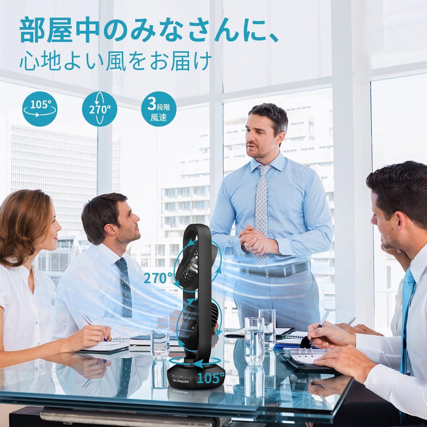 【デュアル調整可能扇風機】Dr. Prepareタワーファンは、回転と振動のデザインを備えています。各ファンを最大270°まで傾けて、場所に正確に向けることが自動首振りできます。