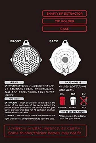 もってる安心 世界で一番強いリムーバー BULL シャフト&チップリムーバー ティップのネジ部分がバレル内に折れて残ってしまった際に利用します。 2BAチップ、No.5チップ、シャフトに対応しております。 また、チップホルダーとしてもご利用いただけます。 使用方法 EXTRACTOR: 裏中央の穴にバレル径に合った付属のアダプターを取り付け、バレルを挿入し→の方向に押し回します。 CASE: 表カバーをOPEN方向に回し、手前に引き出すと取り外せます。