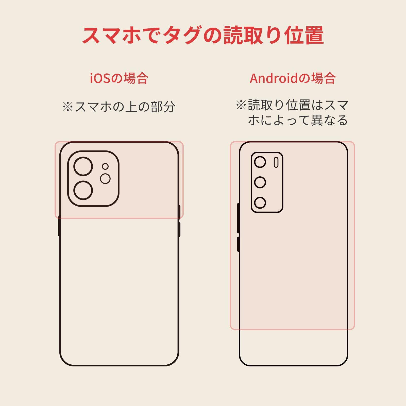 【iOSとAndroid両方で使用可能】iOSもAndroidもSwitchBotタグで各デバイスを操作可能。iOSの場合はタグの読み取り位置が端末上部です。Androidの場合は機種によって読み取り位置が異なることをご注意ください。iOS13以降、Android5.0以降かつNFC機能があることをご確認ください。
