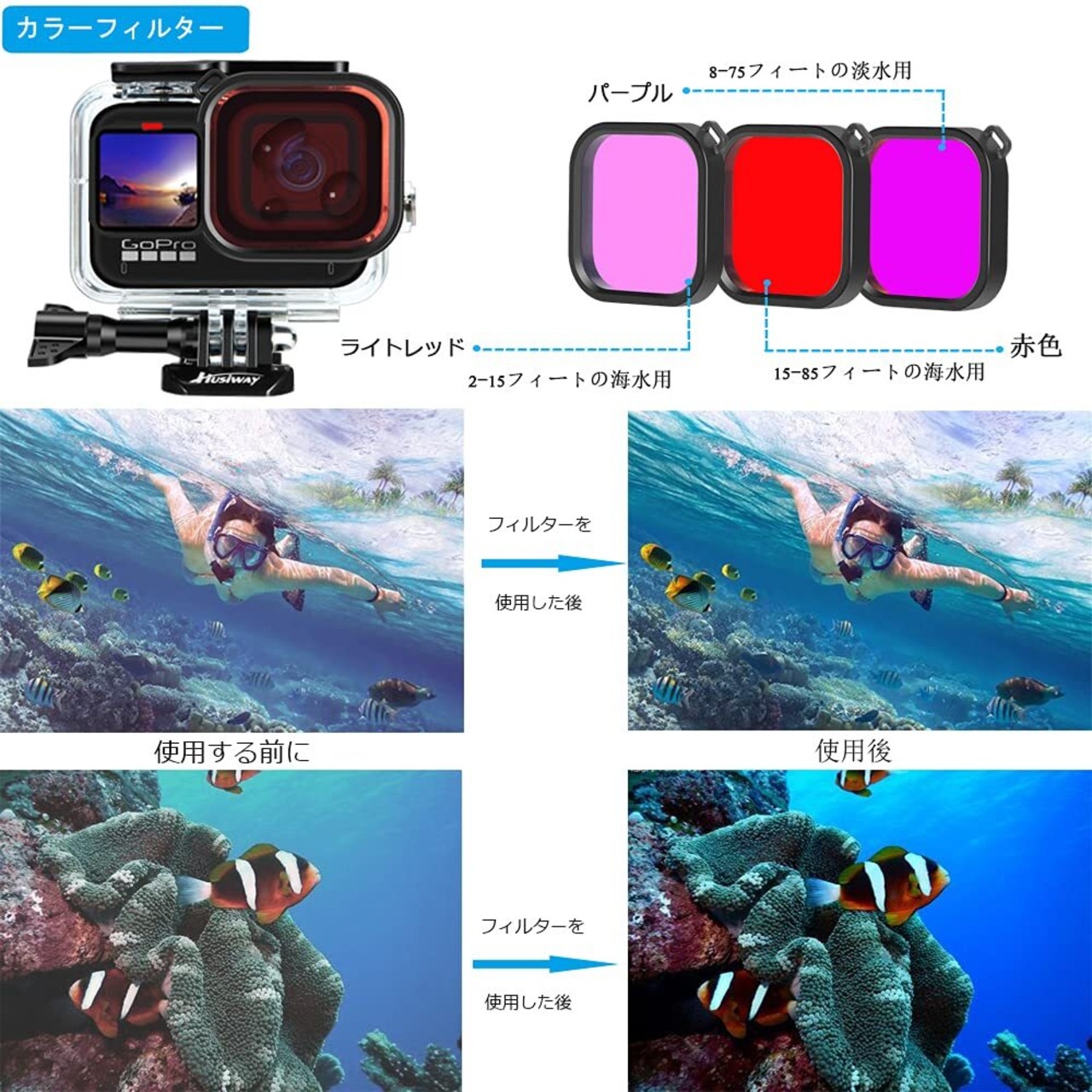 Husiway Gopro Hero 12 Hero 11 Hero 10 Hero 9 用アクセサリーキット付属品黒防水ハウジングシリコンケースガラススクリーンプロテクターはゴープロ Gopro11 Hero11 Gopro10 Hero10 Gopro9 Hero9 と互換性があります62E