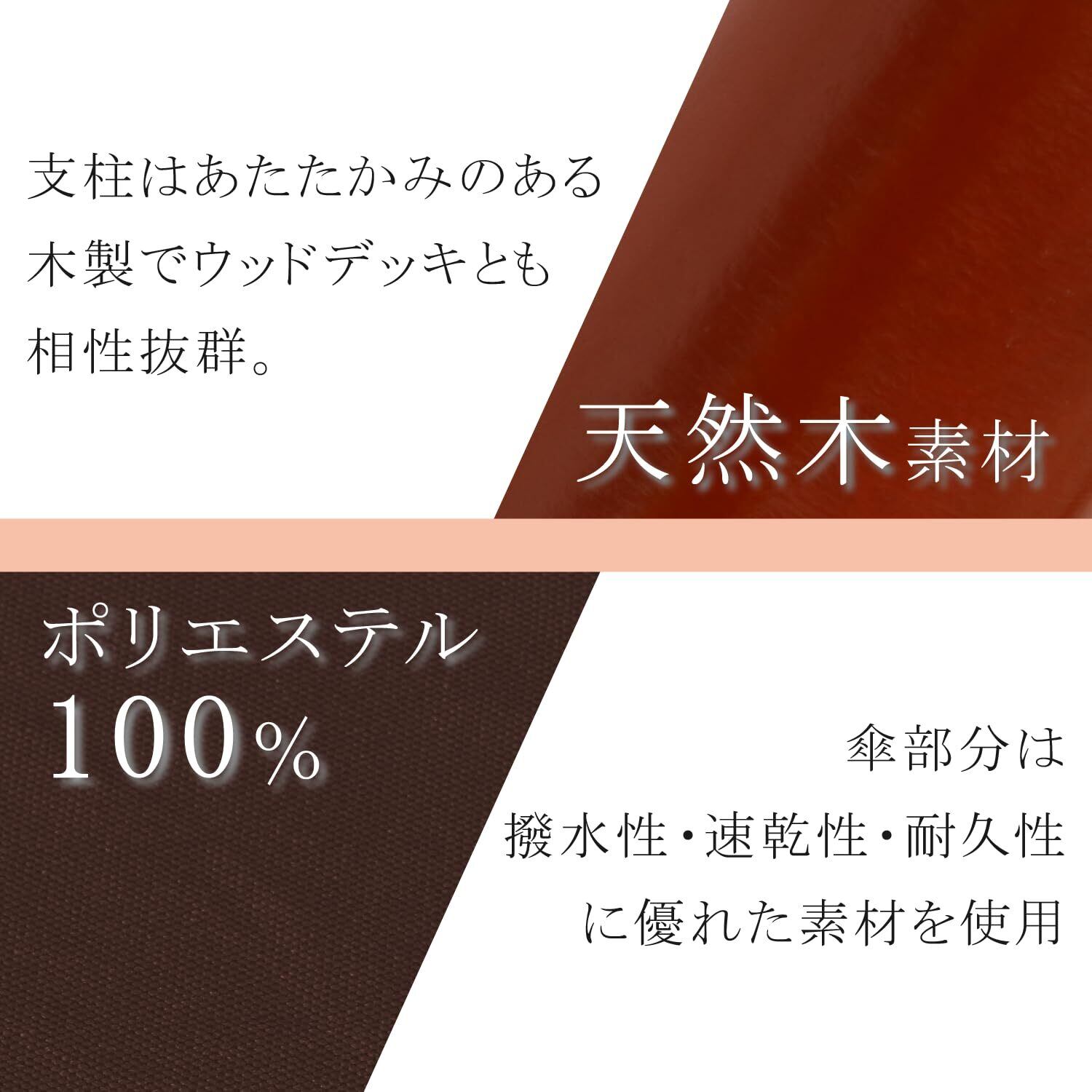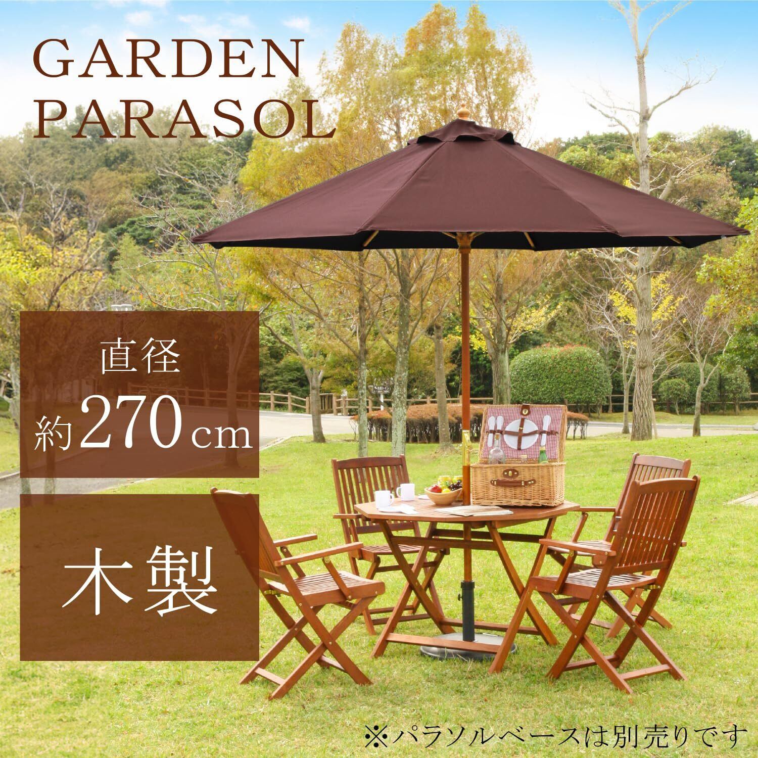 サイズ名:270㎝ | 色名:ブラウン パラソルベースは別売りです。晴れの日を満喫できる、オシャレな木製パラソルです。フレームには天然木を使用しており、リゾート感のあるデザインが人気です。お庭にカフェスペースを設けたり、子供の遊び場の日よけとして等、様々な用途で大活躍します。お店のディスプレイやホームパーティにも大活躍! 至福のひとときをお手軽に。 ご注意(免責)>必ずお読みください ●使用しない時は日の当らない場所にしまって下さい。●風の強い日は仕様を御控え下さい。●熱・火は避けて下さい。●必ず本来の用途だけにご使用下さい。●水平を保てる場所に設置し、ご使用して下さい。●パラソルベースは別売りです。