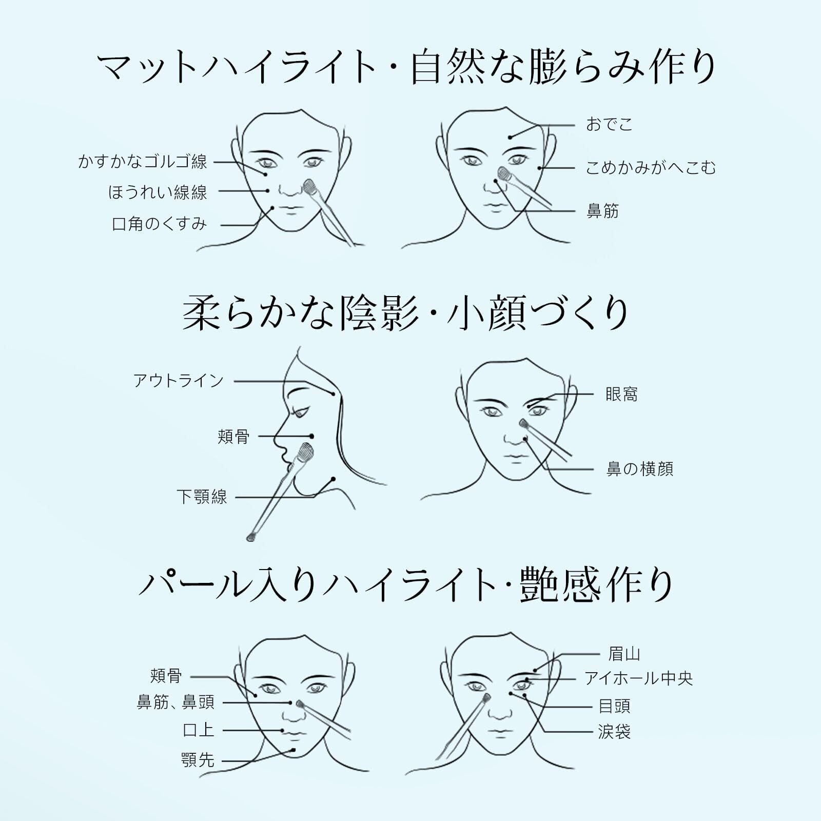 【多彩な使い方】頬骨、下顎線、アウトライン、鼻の横顔、眼窩のところにシャドウを軽くのせると、輪郭が収縮できます。微かなゴルゴ、ほうれい線、口角のくすみ、額、こめかみなどにマットハイライトを入れると、くぼみが改善されます。パールハイライトでチーク、鼻筋、口上、顎先などの部分を明るくすることができて、肌に艶感を与えます。