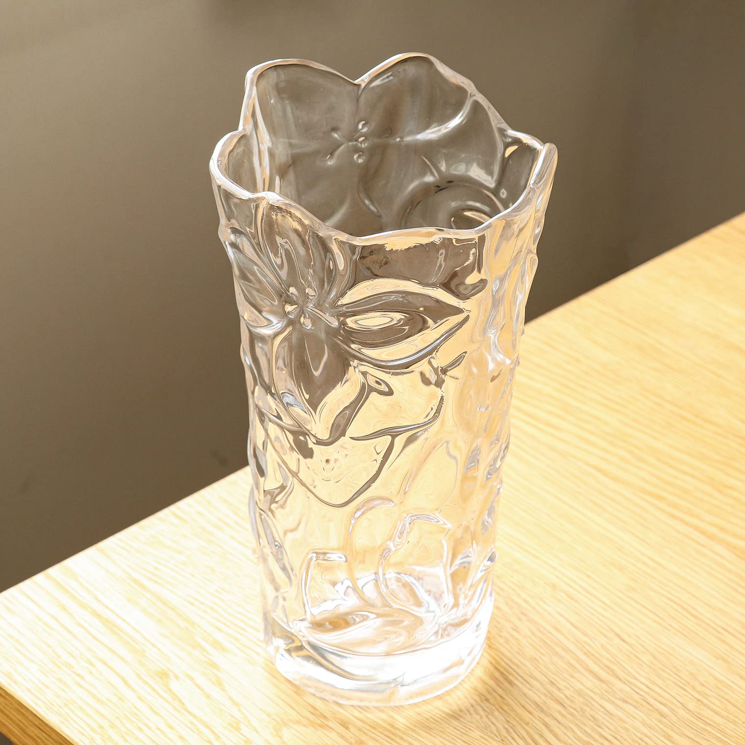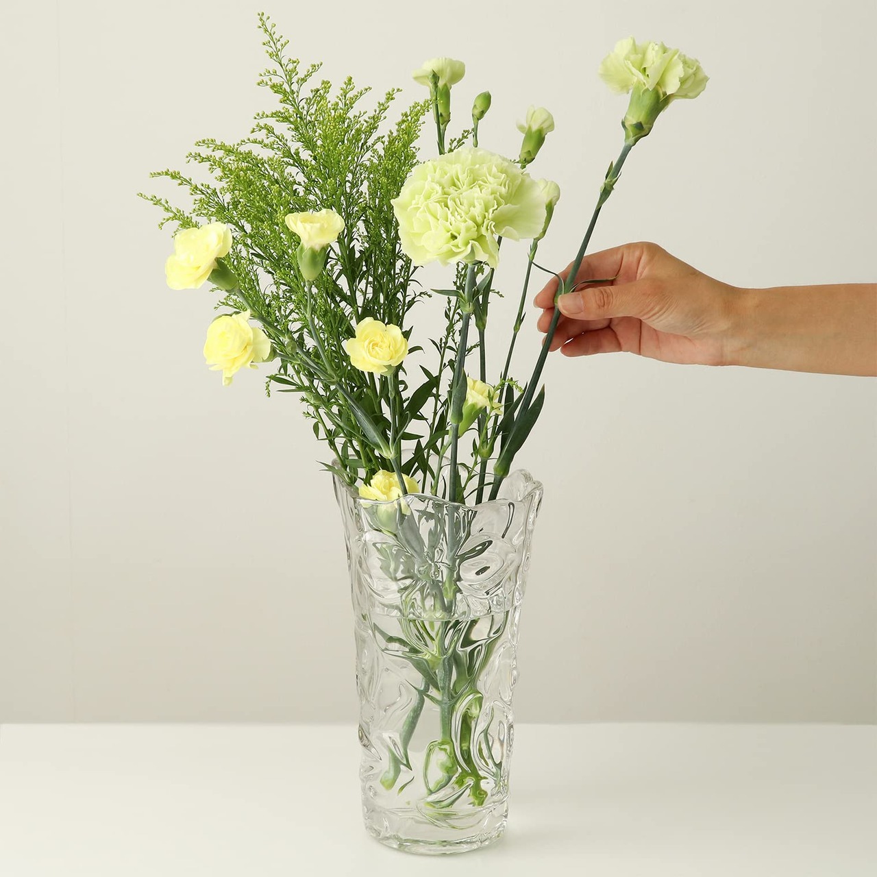 大きな花をふんわりとあしらった柔らかな印象のガラスの花瓶。