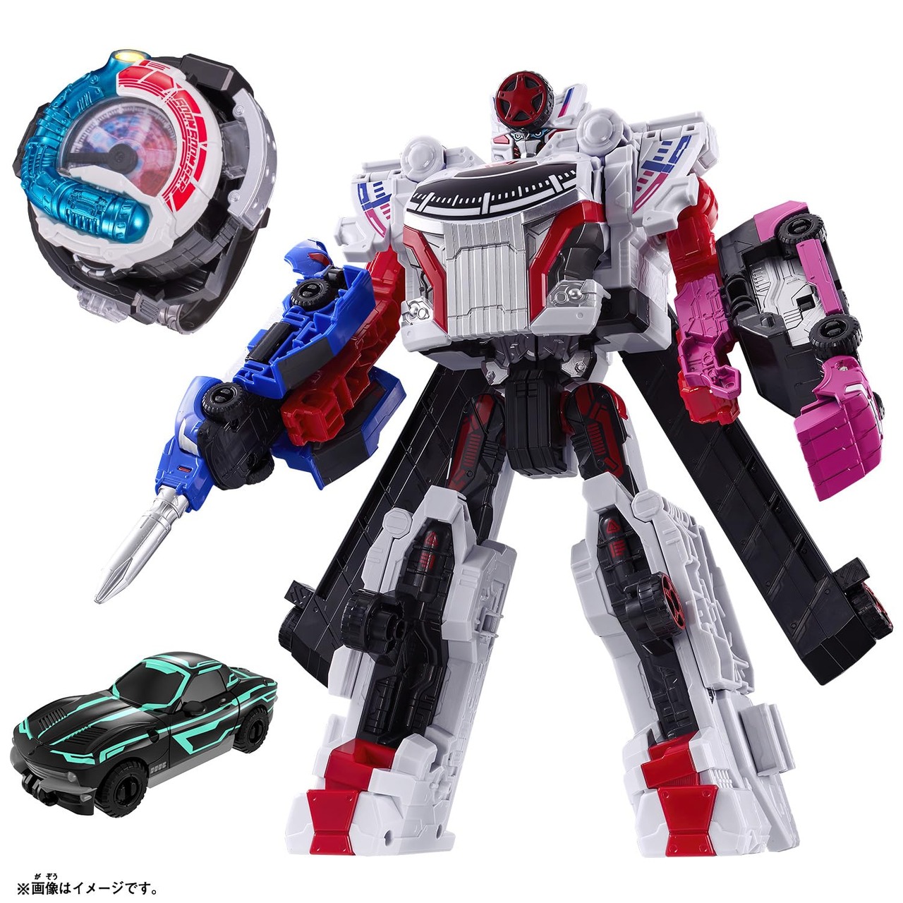 「DXブンブンチェンジャー」「DXブンブンジャーロボ」に、劇中に登場する「ブンブンスーパーカー(バクアゲモードVer.)」が同梱された初回限定のセットです。