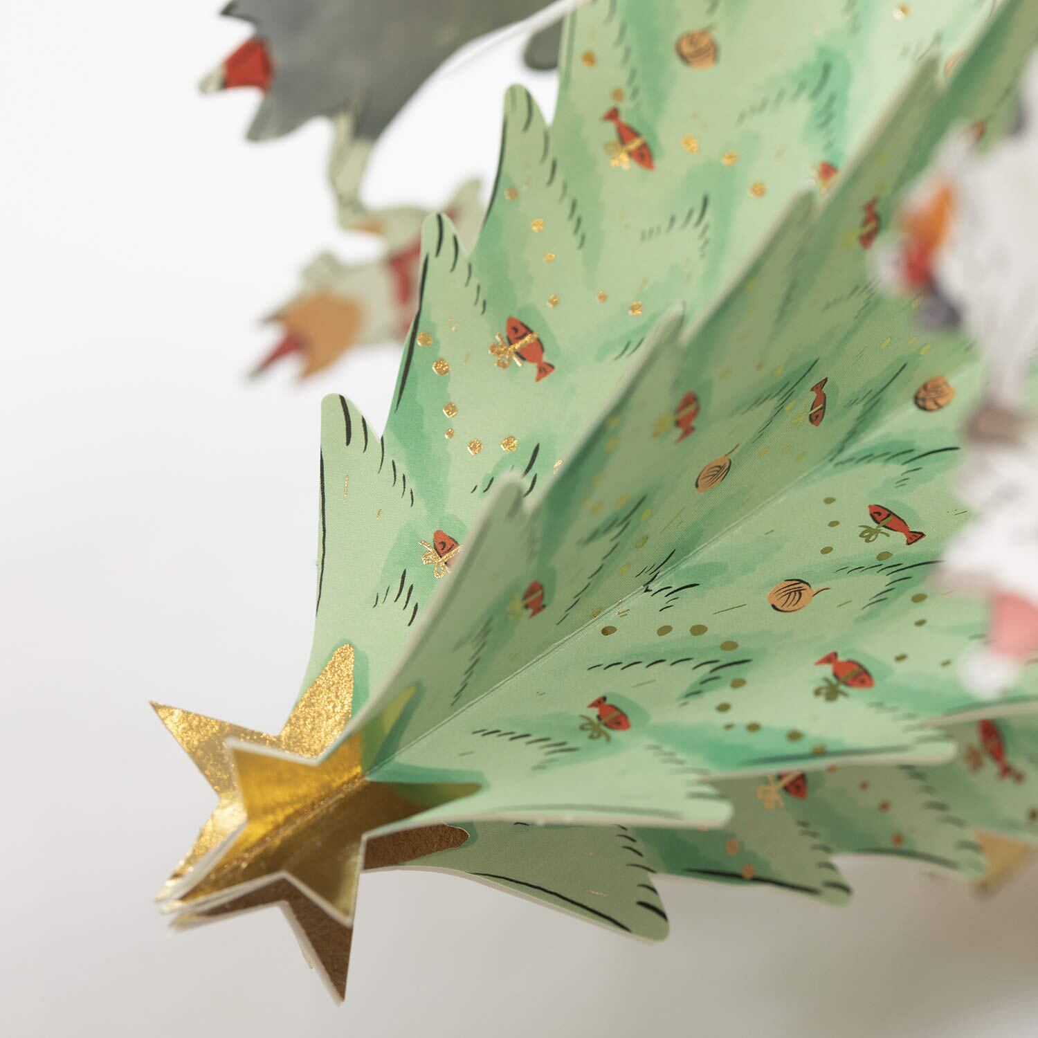 カードを360度ひらいて、ゴムをひっかけるだけで、かわいいネコたちがツリーを囲って踊っている風景がとびだし、