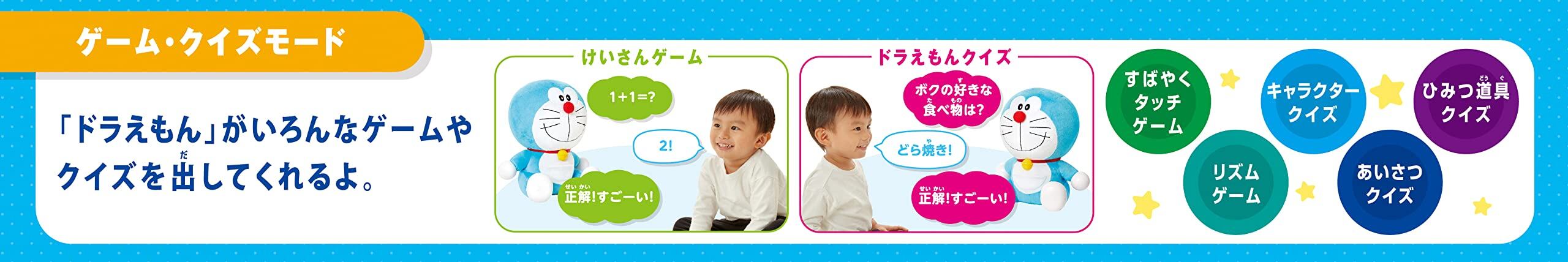 【音声認識】●『コミュニケーションモード』では「ドラえもん」「のび太くん」「ネズミなど10ワードの音声を認識し、認識した各音声に合わせたそれぞれ数種類のおしゃべりをドラえもんが返答してくれます。例:「ドラえもん」→『ボク、ドラえもん! 』『どうしたの?嬉しいことでもあった?』 「ネズミ」→『ぎゃ~~~! ! ! 』『ネズミ! ?ボク、ネズミ大っ嫌い! ! 』●『ゲーム・クイズモード』では7つの遊び中、5つのゲームやクイズの回答を音声認識で正誤判定してくれます。出題例:『ボクの好きな食べ物は?』『5引く2は?『ごはんを食べる時のあいさつは?』【タッチセンサー+傾斜センサー】●7つのタッチセンサー+傾斜センサーも内蔵しており、タッチしたり、逆さまにしても楽しいおしゃべりをいっぱいしてくれます。「四次元ポケット」部はタッチすると6つの「ひみつ道具」のセリフ演出や「ひみつ道具」に関わる遊びができます。 安全警告 なし